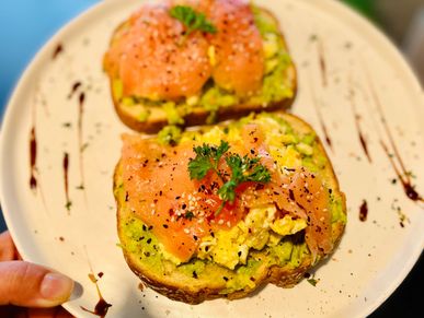 Toasted multigrain bread topped with fresh smashed avocado with organic eggs (fried or scrambled) Add Smoke Salmon $6.25
